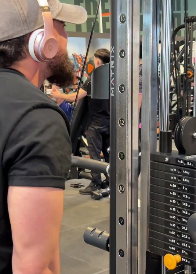 A man wearing a black t-shirt, gray baseball cap, and pink Beats headphones is exercising at a gym
