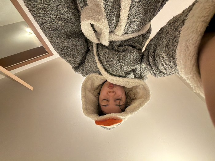 A person wearing a gray and white hooded robe is upside down, looking into the camera. The robe's hood is up, and the person's eyes are closed. The background is a light-colored ceiling and wall. To the left, there is a glimpse of a mirror and a partially visible wooden structure. The lighting appears to be indoor and soft.