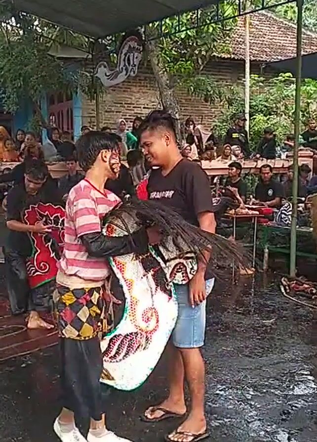 two men standing face to face. The man in the foreground is wearing a striped shirt, black pants, and white shoes. The man in the background is wearing a black shirt and blue shorts. They are surrounded by a crowd of people. The ground is wet, and there is a building with a tiled roof in the background.