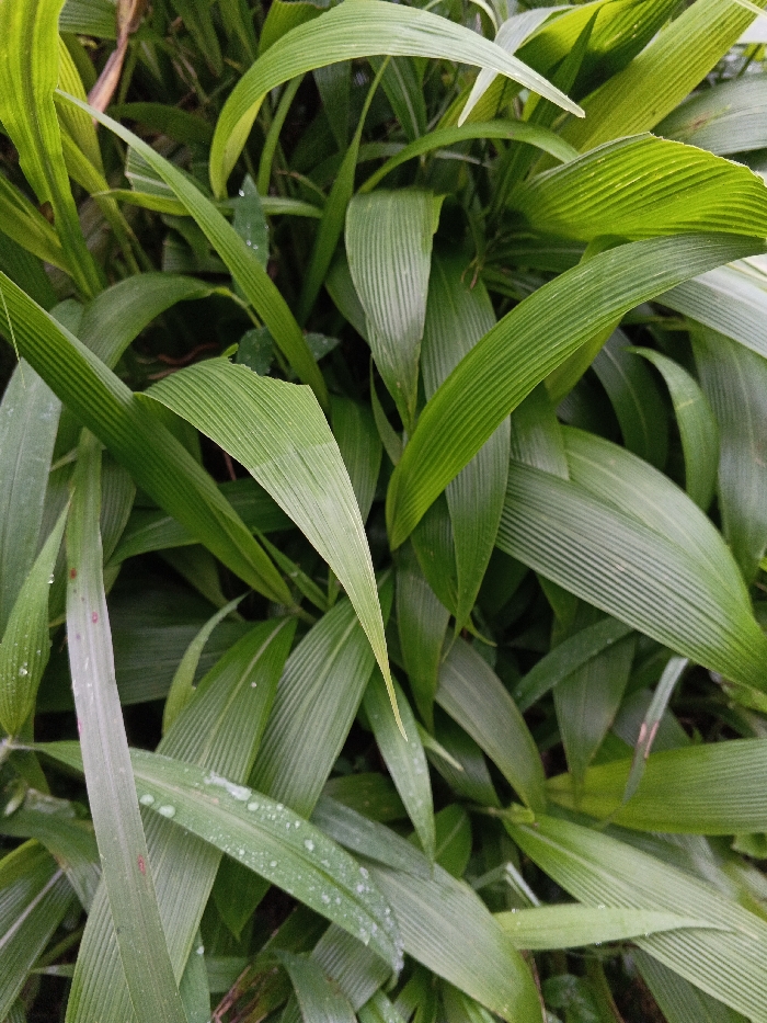 dense cluster of vibrant green grass blades. They're predominantly linear, with distinctive parallel veins running along their lengths. Some leaves are slightly bent or curved, adding depth. Water droplets dot a few blades, suggesting recent rain or dew. The overall composition exudes a sense of lushness and natural abundance.