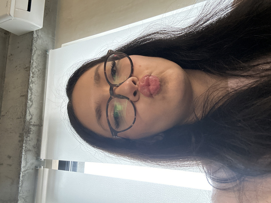 A young female, appearing in a head-and-shoulders frame, is depicted indoors in an unspecified building in Yerevan, Armenia. She has long, dark hair, light skin, and is wearing glasses with dark tortoiseshell frames. Her lips are pursed in a prominent "kissing" expression, and she is looking directly into the camera. She wears a light-colored top, possibly pink. The background reveals a light gray, textured concrete ceiling. Below the ceiling, white vertical window blinds are visible, extending down the left side of the frame. To the right, a section of a light-colored wall is present, on which a white Midea brand wall-mounted air conditioning unit is installed near the ceiling.