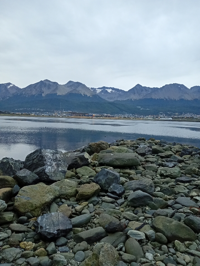 The image displays a static landscape scene in Ushuaia, Argentina. In the immediate foreground, a dense collection of rocks and boulders of varying sizes, shapes, and textures covers the ground, ranging in color from dark gray to greenish-brown. Beyond these rocks, a calm body of water, the Beagle Channel, extends across the midground, reflecting the muted overcast sky. On the distant opposing shore, the city of Ushuaia is visible, characterized by numerous buildings and scattered artificial lights, with a tall, slender communication mast prominently rising from the urban cluster. Behind the city, dark green vegetation covers the lower mountain slopes, leading to a rugged mountain range that dominates the background. These mountains exhibit irregular peaks and distinct patches of snow on their higher elevations. The sky is uniformly light gray and completely overcast. No people are visible, and no overt actions or interactions are occurring.