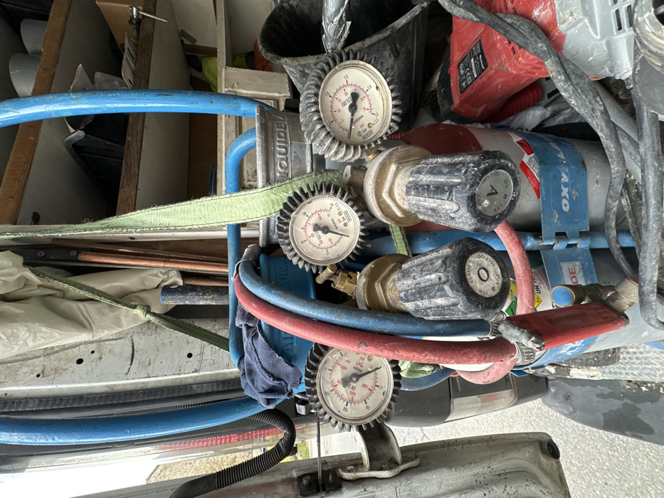 The image depicts the organized rear cargo area of a utility vehicle, likely a van, functioning as a mobile workshop in Orsay, France. In the foreground, two industrial gas cylinders are secured vertically within a blue metal bracket. One cylinder is reddish and partially visible, labeled "AIR LIQUIDE," while the adjacent grey cylinder is labeled "OXYLIQUIDE." Each cylinder is equipped with pressure regulators featuring black, textured control knobs. Three prominent circular pressure gauges with white faces, red and black markings, and pointers display pressure readings in "bar" and "PSI." Red and blue industrial hoses connect to these regulators, with a red valve handle visible on a hose line. A black corrugated hose extends vertically on the left. Green and lighter-colored textile cargo straps are utilized for securing equipment within the vehicle. To the lower right, a red handheld power tool, possibly a grinder, is partially visible. The background reveals additional elements of the mobile workshop: blue tubular frames, a dark blue rag, and wooden shelving holding various containers and tools. The vehicle's open rear door on the left provides a blurred view of the exterior, showing a grey paved surface and a light-colored building.
