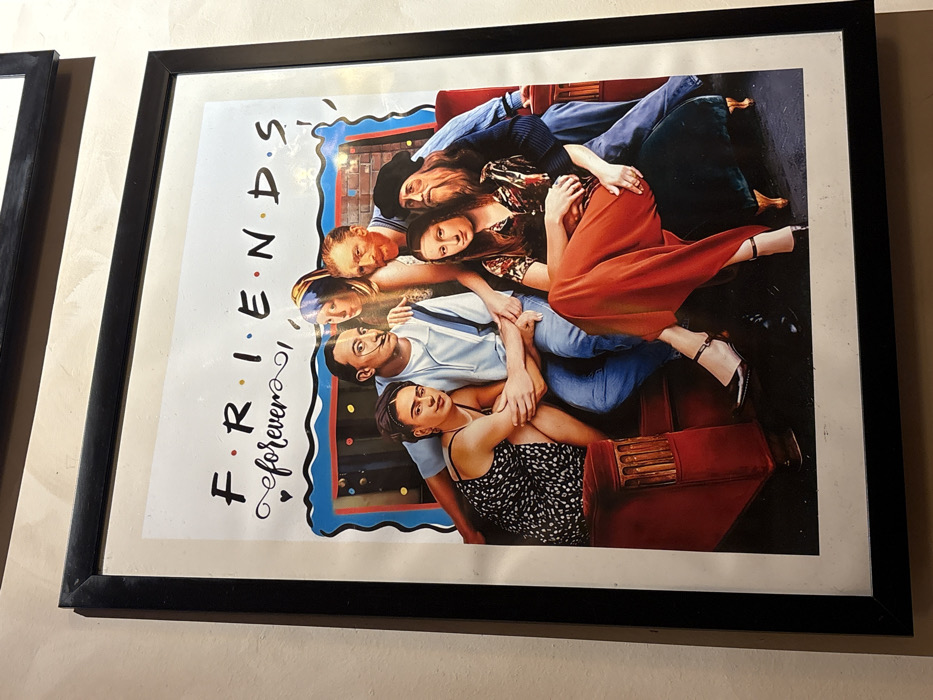 A vertical, rectangular print, enclosed within a black frame, hangs on a textured, light beige wall in the city of Howrah, India. The print features a humorous artistic parody. At the top, the word "F.R.I.E.N.D.S" is displayed in black capital letters with red dots between each, followed by "forever" in a script font with a small black heart graphic below. The main image depicts six figures, styled to resemble famous artists and artworks, arranged as if seated on a couch, mimicking the iconic "Friends" television series poster. From left to right: 1. A woman resembling Frida Kahlo, wearing a black and white patterned dress, is seated on a red upholstered armchair, her left arm draped around the man beside her. 2. A man resembling Salvador Dalí, distinguished by his iconic waxed mustache, wears a light blue polo shirt and blue overalls. He is seated on the red armchair, his right arm around the woman resembling Kahlo, and his left arm around the woman resembling Mona Lisa. 3. Partially obscured behind Dalí and to the right of Kahlo is a woman resembling the "Girl with a Pearl Earring," wearing a blue headscarf and a yellow top. 4. A woman resembling the Mona Lisa is seated in the foreground on a dark green upholstered footrest or low chair. She wears a patterned long-sleeved shirt (red, brown, black tones) and wide-leg orange trousers. Dalí's left arm and the man resembling Van Gogh's right arm are around her. 5. A man resembling Vincent van Gogh, identifiable by his red beard and distinctive features, is seated to the right of the Mona Lisa figure, wearing a light blue shirt. His right arm is around the woman resembling Mona Lisa. 6. To the right and behind Van Gogh, a man resembling Leonardo da Vinci, with long white hair and beard and a dark beret, is seated, wearing a blue shirt. His left arm is around the woman resembling Mona Lisa. The background of the print shows an interior setting with hints of a brick wall and string lights, framed by a wavy blue and red border at the top. The print itself has a white border within the black frame. Subtle reflections are visible on the print's surface, particularly towards the upper right corner. A portion of another black-framed item is visible at the very top edge of the image, above the described print.