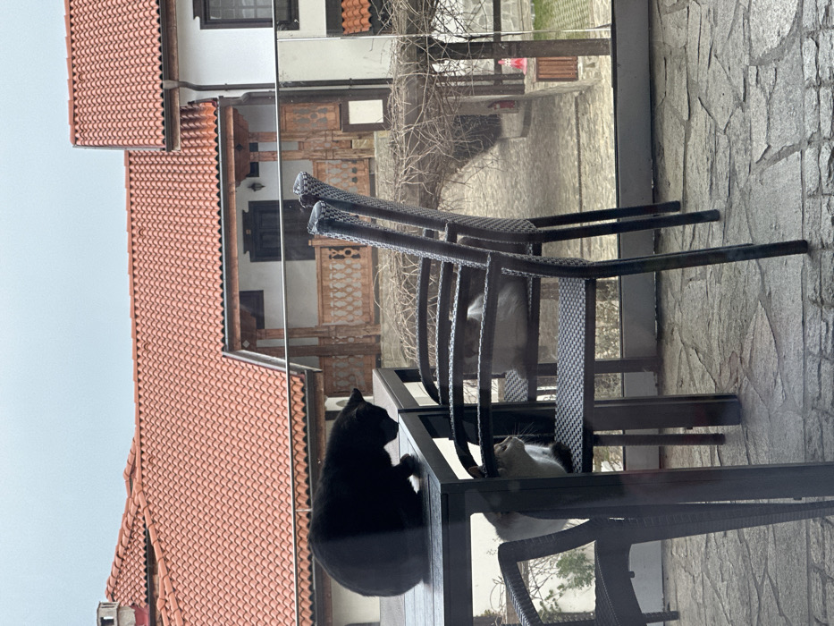 The scene depicts an outdoor patio or balcony area in Krasnovo, Bulgaria, under an overcast sky. In the foreground, a sturdy black cat is positioned atop a dark rectangular table, its head lowered and facing left. Beneath the table, a light-colored tabby cat, primarily white with light brown markings, sits on a dark woven chair, looking towards the left. A third, lighter-colored cat (white or light grey) is seated on another dark woven chair positioned further back and to the right, partially obscured. The ground is paved with irregular stone slabs. A transparent barrier, possibly glass, runs across the mid-ground. Beyond this barrier, a paved path leads under an archway heavily draped with bare, gnarled vines. To the right of the archway, a red cylindrical fire extinguisher is mounted on a light-colored wall. In the background, traditional Bulgarian buildings are visible, characterized by prominent red terracotta tile roofs, white facades, dark windows, and ornate wooden balconies with intricate balusters. The sky is uniformly light grey and overcast. No human subjects are present.