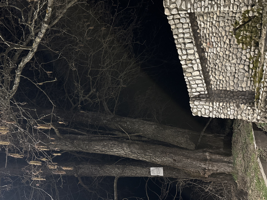 The scene depicts an outdoor environment at night in Velingrad, Bulgaria. The central and left portions of the frame are dominated by three large, bare deciduous trees with textured bark. Numerous light-brown catkins hang from their branches. A white, rectangular paper sign or flyer is attached to the lower trunk of the leftmost tree. To the right, a substantial structure, possibly a wall or fountain, is constructed from light-colored, rounded river stones set in mortar. This stone structure features a prominent rectangular recess and has a small vegetated area at its base containing green moss and a diminutive evergreen plant. The ground beneath the trees is covered with sparse vegetation and earth, with a concrete curb or step visible in the lower left foreground. Artificial illumination from an unseen source lights the foreground elements, casting a diagonal beam across the scene and contrasting them against the uniformly dark background of the night sky. No individuals or discernable actions are present.