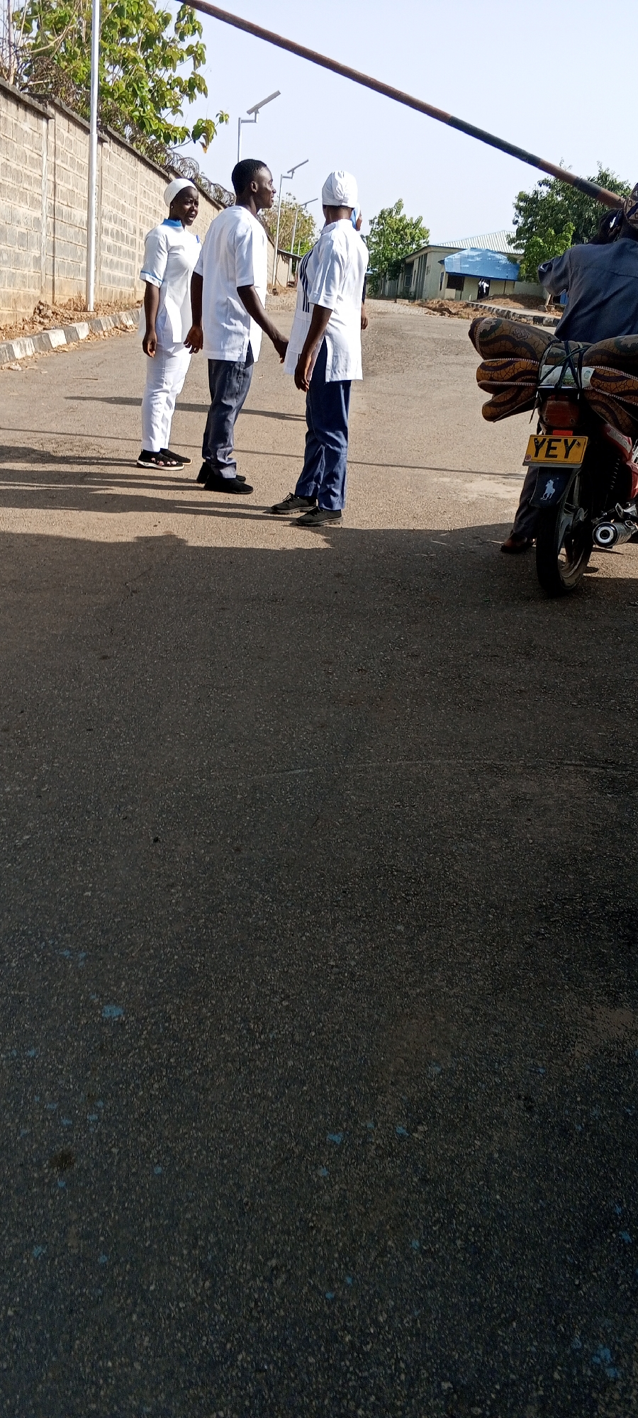 street scene in Keffi, Nigeria. Three individuals in white shirts and dark pants are standing on the left side of the road. A woman in a white dress and head covering is to the left, and two men are talking next to her. To the right of the group, a motorcycle with a yellow license plate reading "YEY" is parked with a person sitting on it. Bundles are strapped to the back of the motorcycle. The road is asphalt, and a brick wall runs along the left side of the street. A metal pole extends across the top of the image.