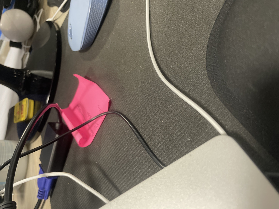 The scene depicts a segment of a workstation in Durban, South Africa, primarily focused on a dark grey, textured desk mat. A bright pink sticky note, visibly crumpled and with faint markings, rests centrally on the mat, partially covered by a thin black cable. This black cable originates from the upper left and curves across the center. Another, thicker black cable is visible further back, connected to a blue VGA connector which plugs into a black rectangular adapter. To the right, a light blue wireless computer mouse with a textured side panel is positioned on the mat. From the bottom left, a white cable extends across the mat, curving towards the right. In the blurred background, a glossy black monitor stand base is present, along with a yellow object and a white spherical item. The corner of a white electronic device is visible in the lower left foreground. No people are present.