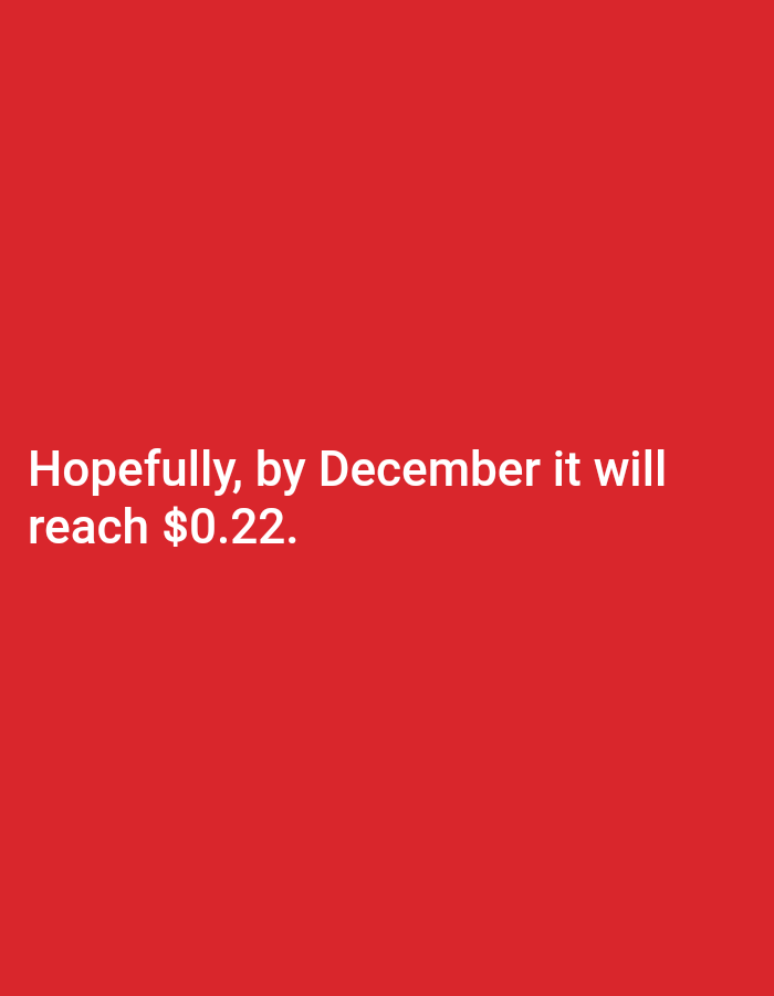 The image displays white sans-serif text on a solid red background. The text, centered on the left half of the frame, reads: "Hopefully, by December it will reach $0.22." No individuals, physical objects beyond the text, actions, interactions, or a discernible physical environment are depicted. The image contains no visual information to determine a specific geographical location, including the city of Mns Alue, Indonesia.