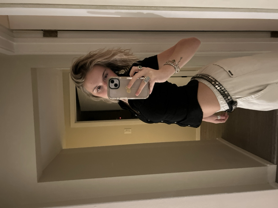 A person with blonde hair takes a selfie in a mirror. She's wearing a black, button-down shirt and light-colored pants with a studded belt. She has rings on her fingers and bracelets on her left wrist. The background shows a hallway in neutral tones, with a glimpse of a room at the end. The photo is oriented sideways.