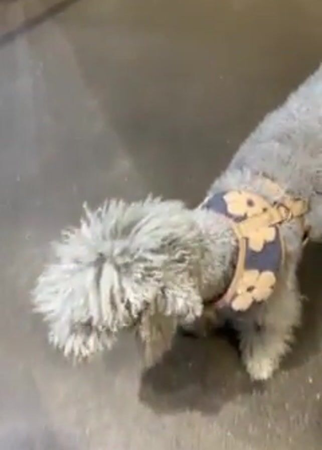 A small, gray, fluffy dog wearing a harness with flower designs is standing on a concrete surface