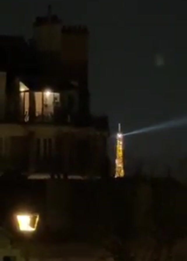 Eiffel Tower at night in Paris, France. The tower is lit up with gold lights and emits a bright light beam. In the foreground, a street lamp is illuminated and part of a multi-story building with a small tower is visible. The night sky is dark. Someone is speaking in the background, but the language is not clear.