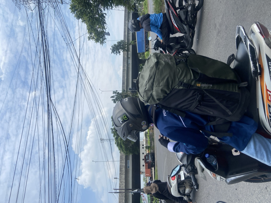 Two people on motorcycles stand near an overpass. The riders wear helmets and jackets. A large green and black backpack is strapped to the back of one motorcycle. Overhead, a complex network of electrical wires crisscrosses the sky. Vehicles, including a truck, are visible on the road below the overpass. The sky is partly cloudy.