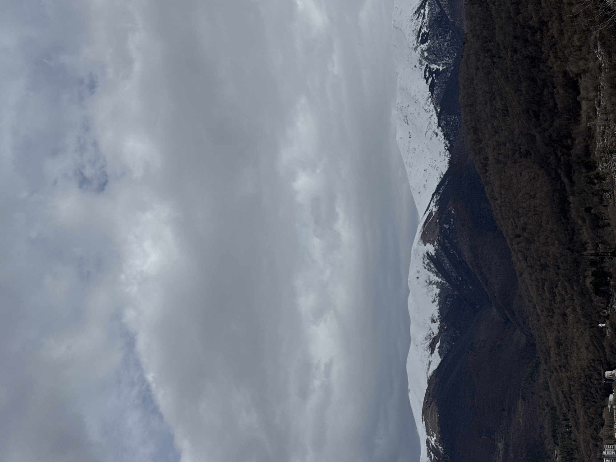 The image depicts a mountain range partially covered in snow, with a dense forest along its lower slopes, set against a cloudy sky. The location is Dilijan, Armenia, based on visual characteristics of the landscape. The sky is predominantly gray, with varying cloud formations. The right side of the image shows the mountain with dense foliage, transitioning to snow cover at higher elevations. A few buildings are visible at the base of the mountain.