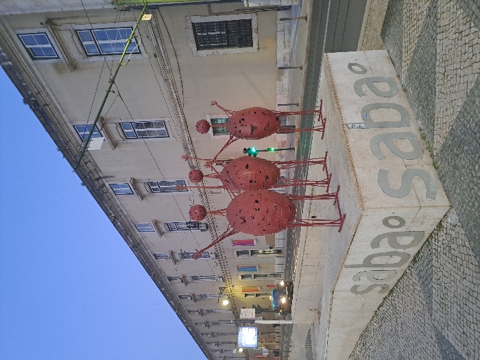 The image depicts an urban scene at dusk or early night in Lisbon, Portugal, specifically at Praça dos Restauradores, in front of the Palácio Foz. In the foreground, three abstract, humanoid-like sculptures stand erect on a light-colored concrete planter. Each sculpture is constructed from red, perforated metal, featuring a large spherical body, thin stick-like limbs, and a smaller spherical head with etched facial features including eyes, a nose, and a smiling mouth. Their arms are raised, suggesting dynamic motion. The concrete planter has the word "saba" engraved or painted in light gray lowercase letters multiple times along its visible sides. The planter rests on a traditional Portuguese cobblestone pavement displaying a geometric pattern. In the mid-ground, a multi-story building with a light-colored facade and numerous rectangular windows, many with white frames, extends horizontally across the frame. To the right of the sculptures, a paved road is visible, with a green traffic light active on the far right. A dark-colored vehicle, possibly a taxi, with its headlights illuminated, is driving on the road in the distance. Overhead, multiple dark wires and a green support pole are visible against the deep blue twilight sky. A street sign or display board is partially visible on the far left sidewalk.