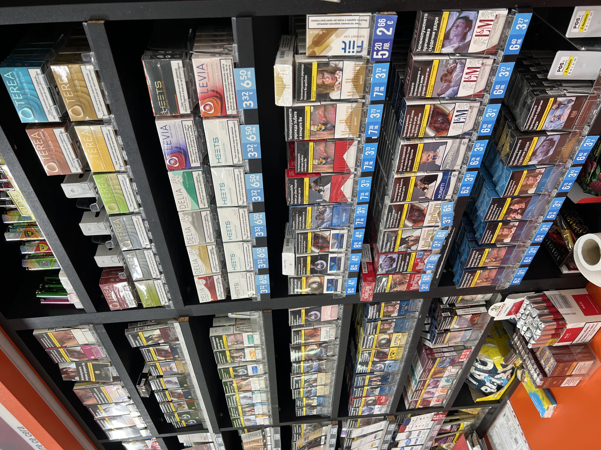 - "This image shows a shelf display filled with various tobacco products in what appears to be a retail environment" by FM-9HlMr1, licensed under CC BY 4.0