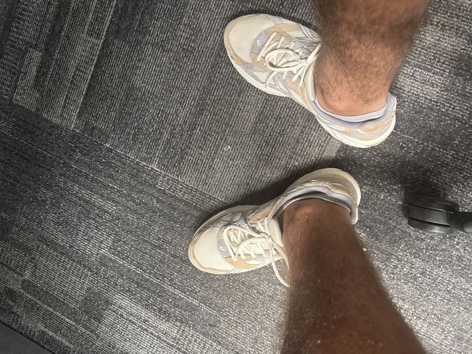 - "The image depicts a top-down view of a person's bare legs and feet, clad in light-colored athletic shoes, positioned on a patterned dark grey carpeted floor in Bnei Brak, Israel" by FM-wmFI13, licensed under CC BY 4.0