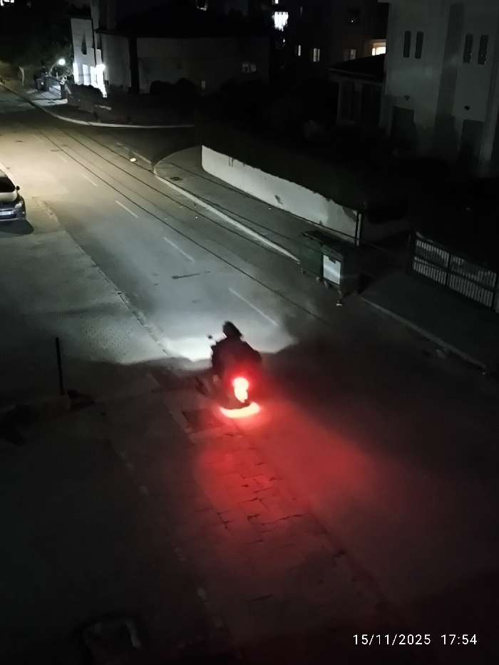 At night, a person on a motorcycle is driving down a street. The motorcycle's headlights are illuminating the road ahead, and the taillight is casting a red glow behind it. The street is lined with buildings and trees, and the sky is dark. The timestamp reads "15/11/2025 17:54" at the bottom right.