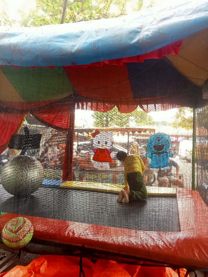 A child is kneeling on a black trampoline within a colorful, netted enclosure. A large, textured ball sits to the left, and a colorful ball rests on the red padded edge. Cutout figures of Hello Kitty and Doraemon hang inside the netting. The enclosure has a striped tent roof in shades of blue, red, and green. A blurred background shows hints of trees and outdoor structures.