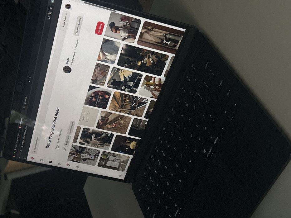 A black laptop is positioned at an angle on a light-colored, flat surface, likely a desk. Its screen displays a Pinterest interface primarily in Russian, featuring the title "Ваши сохраненные идеи" (Your saved ideas) and a user profile labeled "sasha" with 38 followers and 11 following. The browser's URL bar shows `pinterest.com/sashaxd_pins/` and other tabs. A grid of various images, or "pins," is visible on the screen, depicting themes such as minimalist lifestyle items, interior design concepts, food (e.g., a bowl of berries, a bottle of rosé wine), and miscellaneous subjects like a skeletal hand. The laptop's black QWERTY keyboard is partially visible in the foreground. Reflections appear on the screen surface, indicating an external light source. The background is dark and indistinct, providing no specific environmental details. No people are directly visible. There are no discernible elements within the image that identify its specific location within Paris, France.