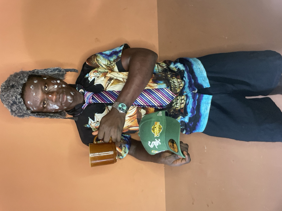 An individual, identified as male, is depicted in a full-frontal, waist-up portrait against a plain orange-brown wall in Mosafejaw, Nigeria