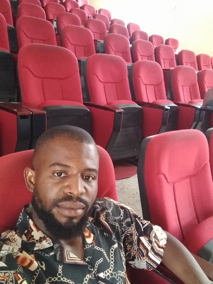 A male individual with dark skin, short dark hair, and a full beard is seated in the foreground, looking directly at the camera. He is wearing a short-sleeved collared shirt featuring a pattern of gold chains, geometric shapes, and some floral elements on a dark background. Behind him and extending to the sides are multiple rows of unoccupied red upholstered auditorium-style seats. These seats have dark grey bases and armrests, some with dark wooden accents, and are arranged in an ascending manner. A light-colored wall is visible in the upper background, and a light-colored floor is visible beneath the seats. The scene is an indoor auditorium located in Abobo, Nigeria.
