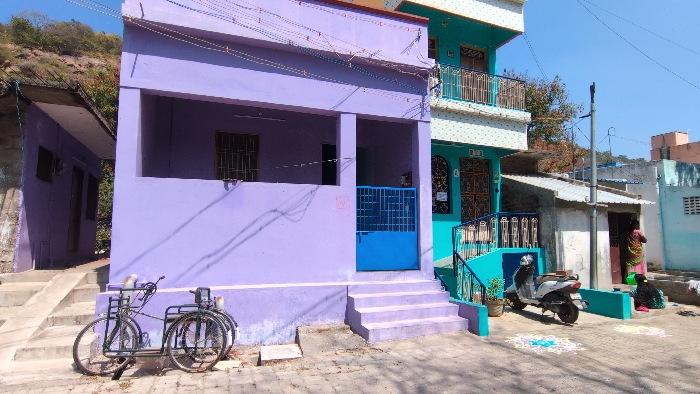 A vivid street scene showcases two houses painted in bright colors. The house on the left is purple with a blue gate, and a tricycle is parked in front. The house to the right is turquoise. A scooter is parked on the street in front of a small building with a metal roof. A woman in a colorful sari is seen near the scooter. The scene is bathed in bright sunlight.