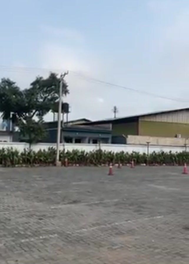 large empty parking lot paved with grey bricks. Orange cones are scattered along the edge of the lot, near a low hedge. Behind the hedge are several buildings, including a large, warehouse-like structure with a green and beige exterior. In the background, there's a building with a sign that reads "EVENT HALL". A white van drives across the lot. The sky is overcast with light grey clouds. There are power lines and utility poles visible in the background. The video appears to be taken on a clear day.