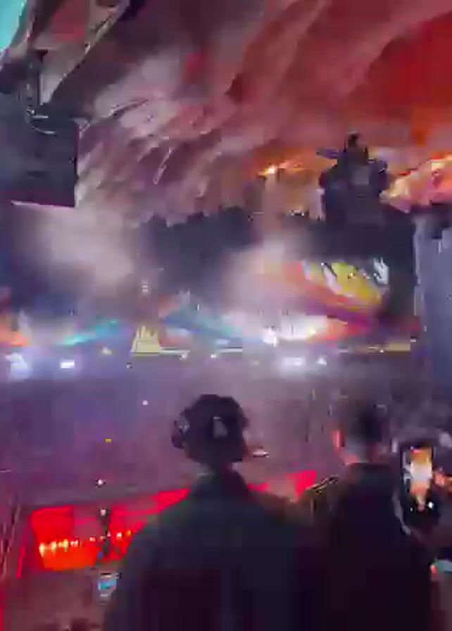 From the perspective of the DJ booth, two figures stand before a massive crowd, bathed in dynamic lighting and swirling fog
