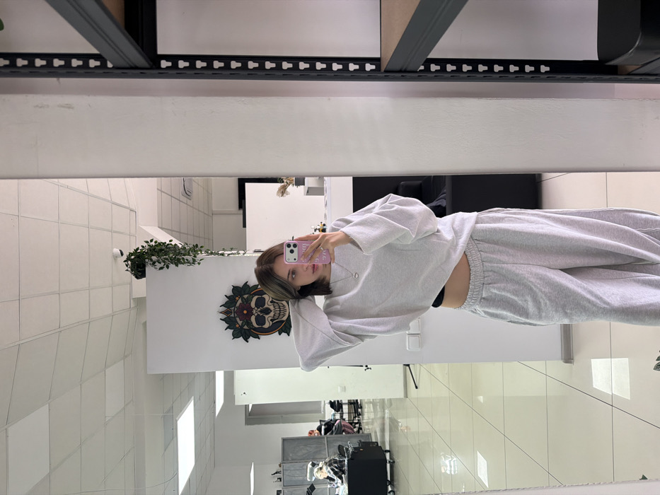 This image depicts an indoor scene in Rostov-on-Don, Russia, captured as a mirror selfie. The primary subject is a young female, centrally positioned, looking directly at her light pink smartphone, which she holds with both hands. Her left hand is raised, with fingers near her left ear, while her right hand supports the phone. She wears a light grey oversized long-sleeved sweatshirt, a black crop top visible underneath, light grey wide-leg sweatpants, and a silver necklace with a circular pendant. Her hair is shoulder-length, straight, brown with lighter streaks. The environment, visible in the mirror's reflection, is a brightly lit commercial interior. The floor is light-colored and reflective, and the ceiling consists of white square acoustic tiles with integrated fluorescent lighting. A black dome security camera is mounted near the ceiling line above a hanging plant. On a white wall to the left of the subject's reflection, a circular art piece features a stylized skull adorned with a wreath of green leaves and red flowers. Below this art, two white electrical outlets or switches are visible. A plant with green trailing vines hangs above the skull art. To the far left, an open-plan area contains multiple workstations. Two individuals are partially visible: one seated in a dark chair with their back largely to the mirror, and another seated further back. A black mobile trolley is present near the foreground workstation. To the right of the subject's reflection, a vertical black metal shelving unit with multiple empty shelves is visible against a white wall. Further into the background on the right, a dark recessed area contains faint details of light-colored decorative items.