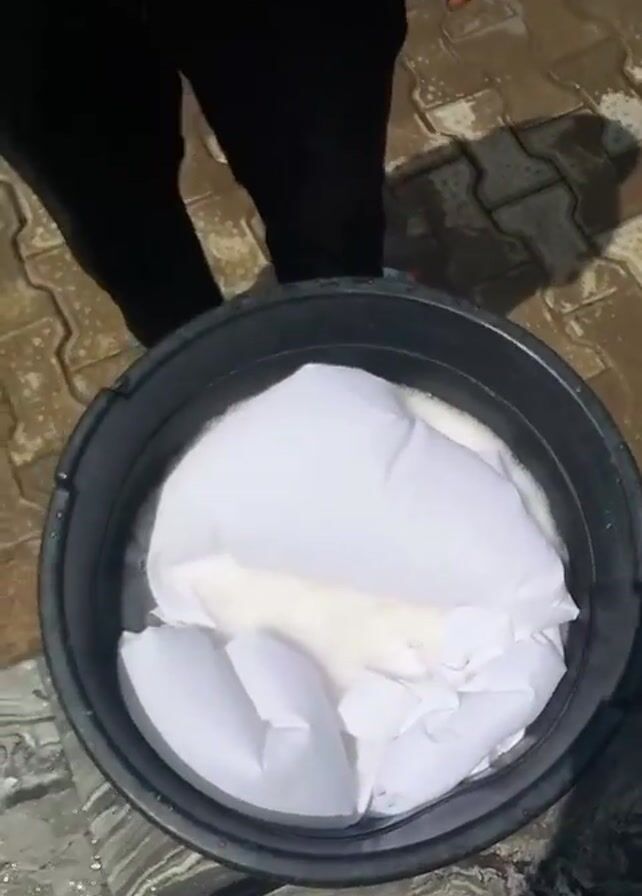 shirtless man washing white linens in a black bucket outdoors on a sunny day
