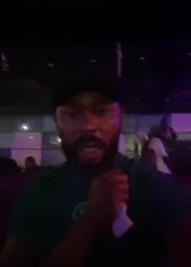 A man with a beard and wearing a black baseball cap and a green shirt with the word "NIGERIA" printed on it, is recording a video while standing in a dimly lit area. He is holding a white tissue in his hand and gesturing with it. In the background, there are other people, some sitting and some standing, and a wall with a checkered pattern. The lighting is dark, with some purple and blue light visible in the background. The overall impression is that it might be a bar or lounge setting.