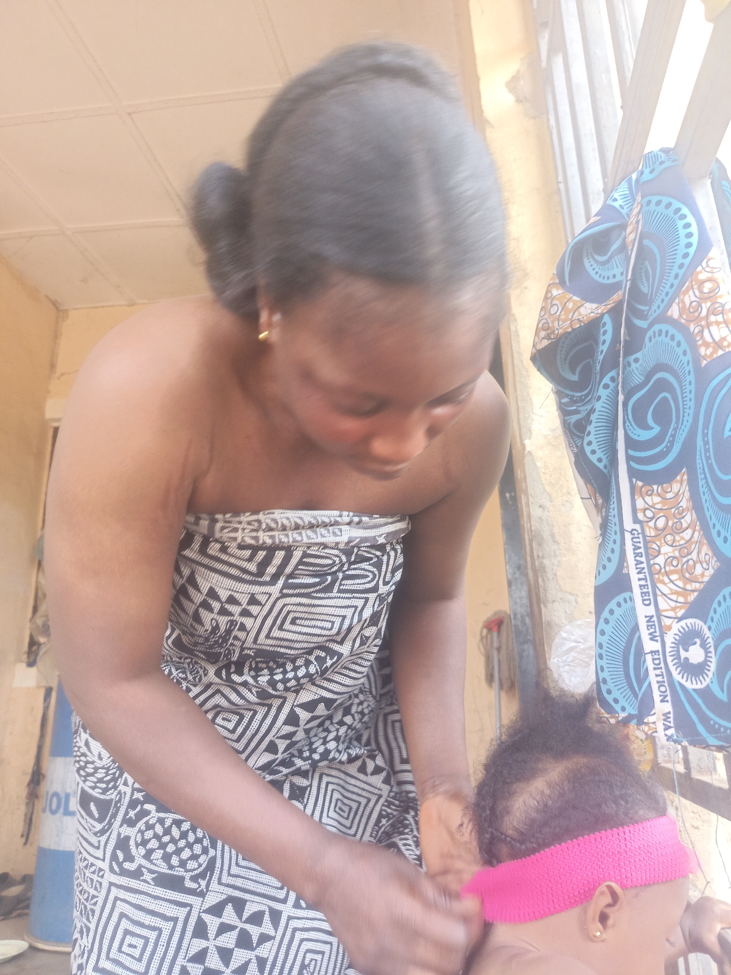 An adult female, positioned in the foreground, is attending to an infant or young child in a domestic or semi-outdoor setting in Akwanga, Nigeria. The female has dark skin, black hair styled back, and wears small gold stud earrings. She is dressed in a strapless black and white patterned fabric wrap, appearing bare-chested from the waist up. Her gaze is directed downwards towards the child. The child's back of the head is visible, showing dark, curly hair and a bright pink woven or knitted headband. A small gold stud earring is present in the child's visible right ear. The female's hands are positioned near the child's head, suggesting an action such as adjusting the headband or tending to the child. In the background to the left, a blue and white conical object, possibly a traffic cone, with the partial text "OL" is visible. To the right, a piece of patterned fabric, likely an Ankara wax print with blue, black, and orange circular and curvilinear designs, hangs vertically from a light-colored metal bar structure, possibly a window or security grill. Partial text "GUARANTEED NEW EDITION WAX" is legible on this fabric. The surrounding environment includes light-colored walls, possibly painted or stuccoed, and a light-colored ceiling with visible paneling. The lighting suggests natural daylight.