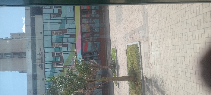 The image depicts an exterior view of the Nairobi Expressway Plaza in Nairobi, Kenya, observed from an interior vantage point through a dark vertical window frame visible on the far right. The foreground is a paved plaza area consisting of light-grey rectangular interlocking blocks arranged in a herringbone pattern. Two small trees with green foliage are planted within distinct raised rectangular garden beds filled with grass. Shadows are cast onto the paved surface from an unseen source. The midground features a multi-story building facade adorned with a colorful mural. The upper section of this mural displays abstract geometric patterns in shades of blue, green, and pink/red, integrated with multiple white-framed rectangular windows, some of which appear partially open. Immediately above this patterned section, a narrower horizontal strip of the mural depicts at least two human figures in a boat-like vessel. The lower part of the building presents large, reflective window panels. In the background, a tall, light-colored concrete high-rise building with numerous windows is visible against a clear blue sky containing sparse white clouds. No human subjects are discernible in the scene.