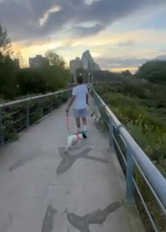 A man walks two dogs on a walkway with metal railings. The man is wearing a white t-shirt, gray shorts, green and white sneakers, and sunglasses. He has short dark hair. The dogs are both white with some dark markings. They are on leashes. The walkway is made of concrete and has some dark markings on it. In the background, there are trees and buildings. The sky is cloudy with a bit of sunlight. The man stops and looks at the camera.