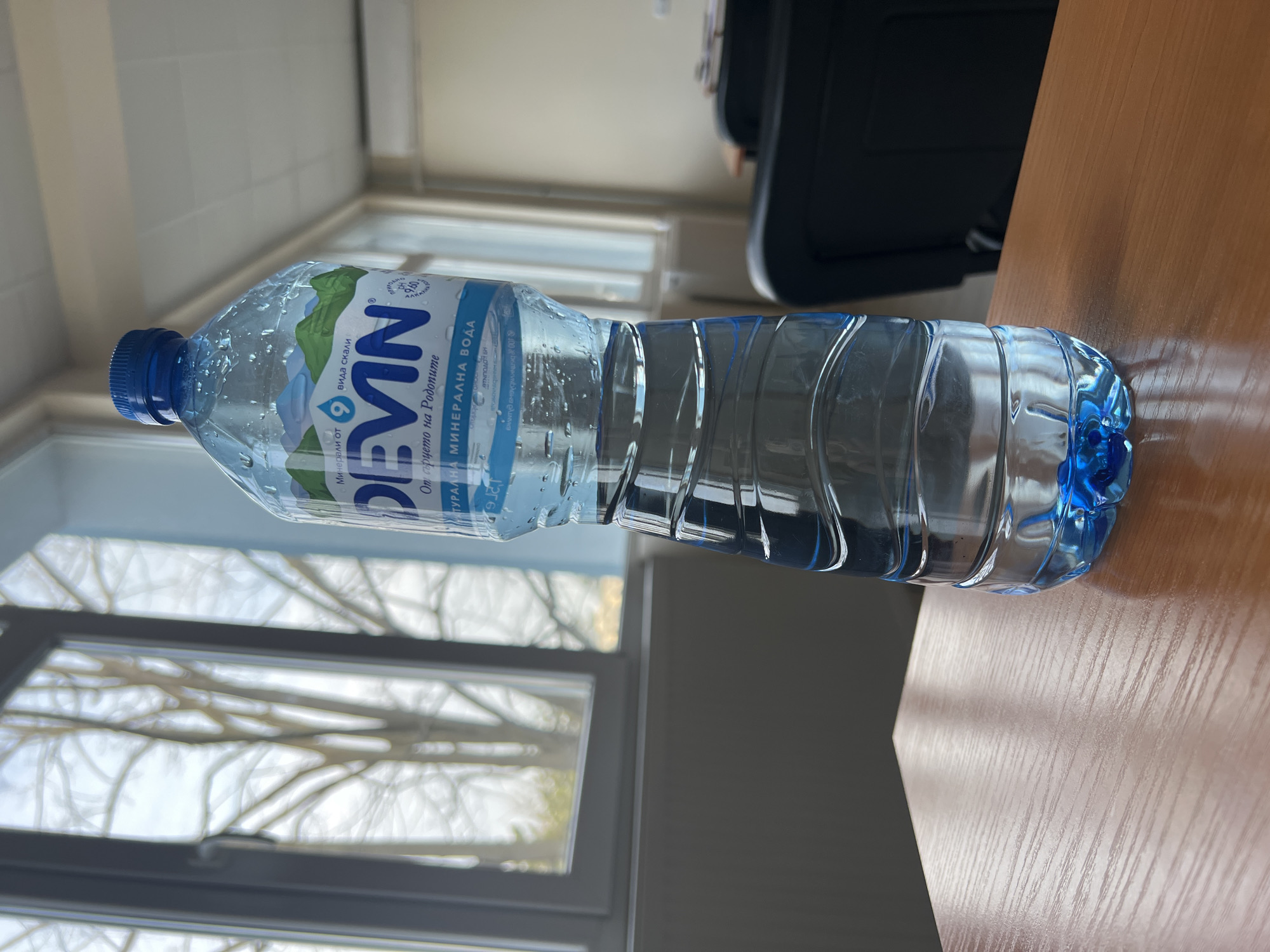 A plastic bottle of DEVIN Natural Mineral Water, approximately half-full with visible condensation, stands upright on a light brown, wood-grain patterned surface. The bottle features a blue screw cap and a blue base; its label displays Bulgarian text, including "DEVIN" and phrases identifying it as natural mineral water from the Rhodopes. In the background to the left, a window with a dark grey frame reveals bare tree branches against a bright, overcast sky. To the right, the interior of a room is visible, featuring a light-colored wall, part of a dark office chair, and a ceiling with panels. No individuals are present in the image. The scene is located indoors within the city of Dolna Mitropolia, Bulgaria.