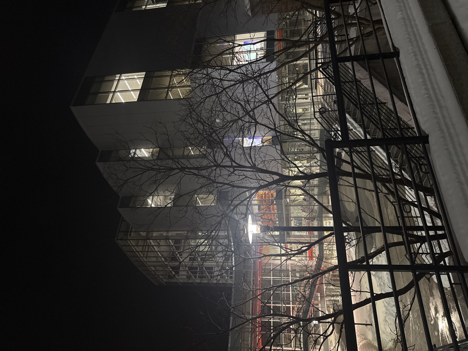 An asymmetrical white building illuminated at night contrasts with a dark sky. A bare tree's branches obscure part of the structure and foreground. The building's architecture features prominent windows revealing interior elements. To the right, a dark metal fence runs vertically along the edge of a snowy curb. A streetlight adds a bright spot in the middle ground, further highlighting the branches. The image is rotated on its side.