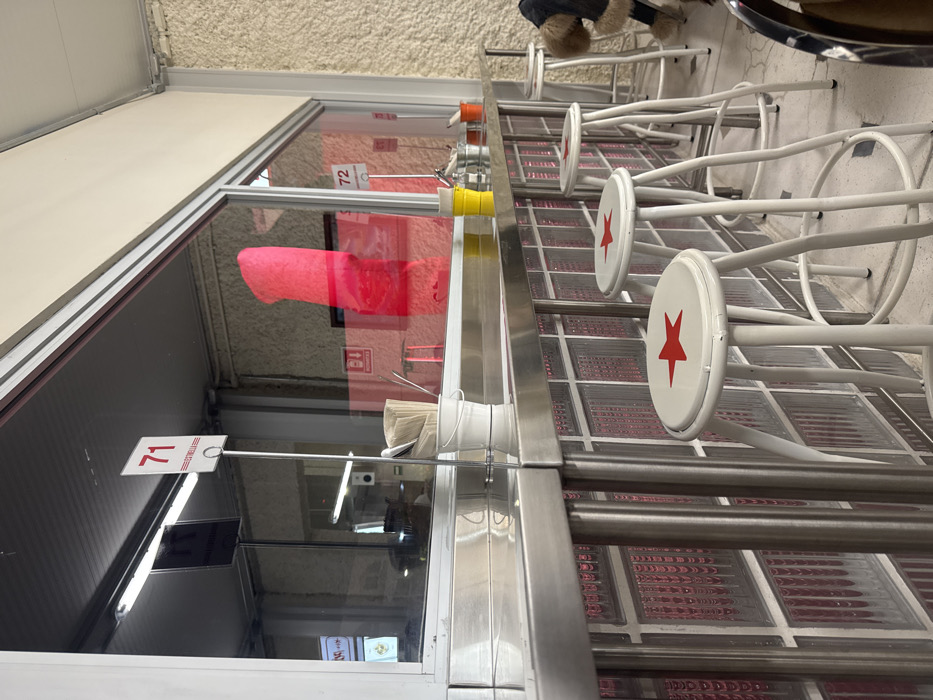 Bar stools with white seats and red stars sit in front of a restaurant window displaying the number 71. A pink inflatable toy is visible through the window, along with a sign with the number 72. The restaurant's interior is reflected in the glass. The floor is made of red glass blocks and metal bars.