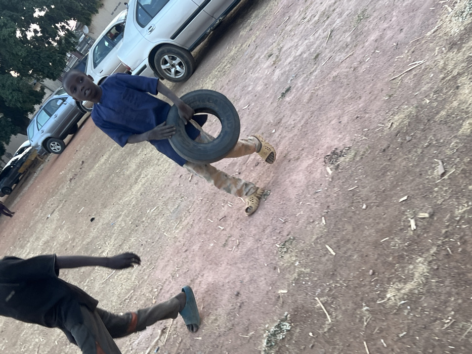 A boy in a blue shirt and light pants holds a tire. He wears sandals. Another boy in a black shirt and gray pants, also wearing sandals, is partially visible in the lower left. Several cars are parked in the background. The ground is dirt and appears to have scattered debris on it.