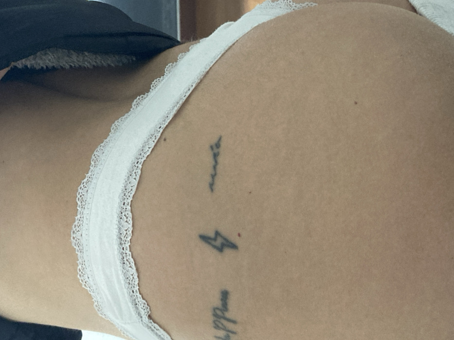 The image displays a close-up, angled view of a person's lower back and upper gluteal area, specifically the right hip. The subject is wearing white underwear with a delicate lace trim along the waistband. A dark, possibly fuzzy, garment is visible pulled up on the upper right side, partially obscuring the waistline. Three distinct black ink tattoos are visible on the skin: a partial word reading "happine" on the left, a stylized lightning bolt symbol in the center, and a script word resembling "santa" or "suerte" on the right. The skin is light-toned with a few small moles visible. The background is out of focus, indicating an indoor environment, with a dark, indistinct rectangular object faintly visible in the upper background. The precise location in Palma de Mallorca, Spain, cannot be determined from the visual information presented in the image. No explicit action or interaction is depicted.