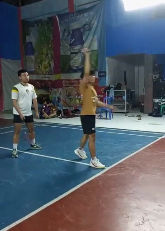 two men playing badminton in an indoor court. One man, wearing a white shirt and black shorts, is standing on the left side of the court. The other man, wearing a brown shirt and black shorts, is positioned on the right side. The court is blue and red, with white lines marking the boundaries. The man in the brown shirt serves the shuttlecock, and the man in the white shirt returns the serve. There is a large banner hanging on the wall in the background with text and images on it. People can be seen seated in the background as well. The lighting in the court is somewhat dim, and the video is shot from a static position.