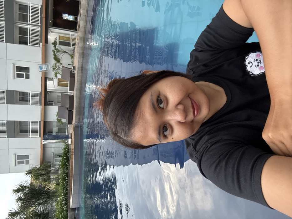 This image captures an adult female at the edge of a swimming pool in Sidoarjo, Indonesia