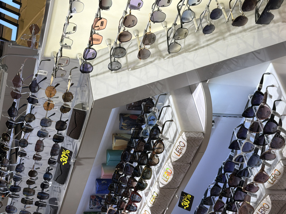 A store display showcases sunglasses arranged vertically on multiple racks. The frames vary in color and style. Discount signs reading "-30%" are visible on two of the racks. Branded "LERO" appears on some of the displays. Overhead, numerous sunglasses hang from the ceiling. The overall impression is a well-stocked retail environment with a wide selection of eyewear.