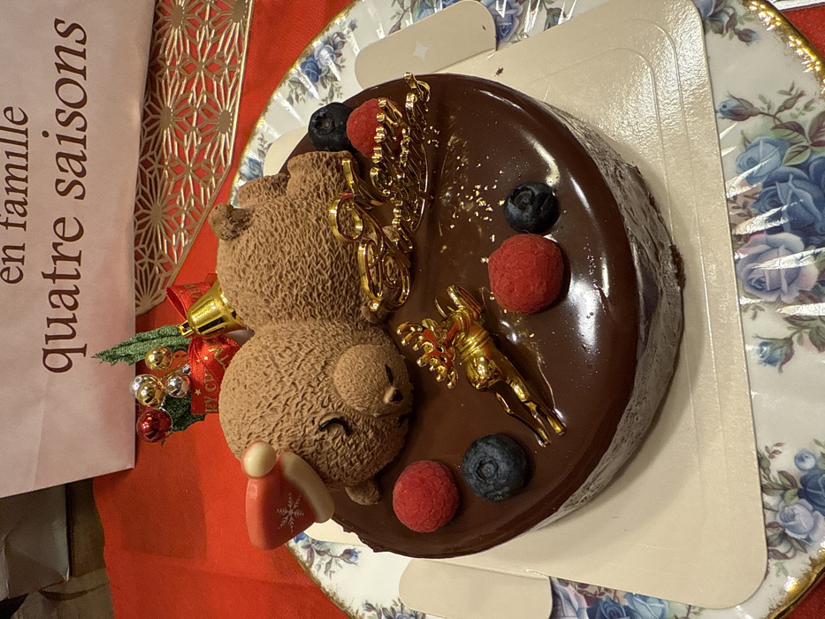A round chocolate cake, approximately eight inches in diameter, is centrally positioned on a white cardboard base. The cake is covered in a dark, glossy chocolate ganache and adorned with various holiday-themed decorations. On the cake's surface are two textured, light brown figures resembling sleeping bears, one wearing a miniature red and white Santa hat with a snowflake pattern. Between the figures, a small Christmas ornament cluster consists of red and gold bells, a miniature green artificial pine sprig, and a red ribbon imprinted with "MERRY CHRISTMAS". Other gold-colored decorations include a "Merry Christmas" script ornament and a small reindeer figurine. The cake is garnished with four red raspberries and three dark blue blueberries, along with scattered gold flakes. The cake and its base rest on a white and blue floral-patterned plate with a gold rim, partially covered by clear plastic wrap. The immediate background features a red fabric surface. In the upper portion, a white paper bag with brown text reading "en famille" and "quatre saisons" is partially visible. To the right of the bag, a gold-colored decorative placemat with a geometric starburst pattern is visible on the red fabric. The "quatre saisons" branding indicates the cake likely originated from Patisserie Quatre Saisons, a confectionery retailer with locations in Kawasaki, Japan.