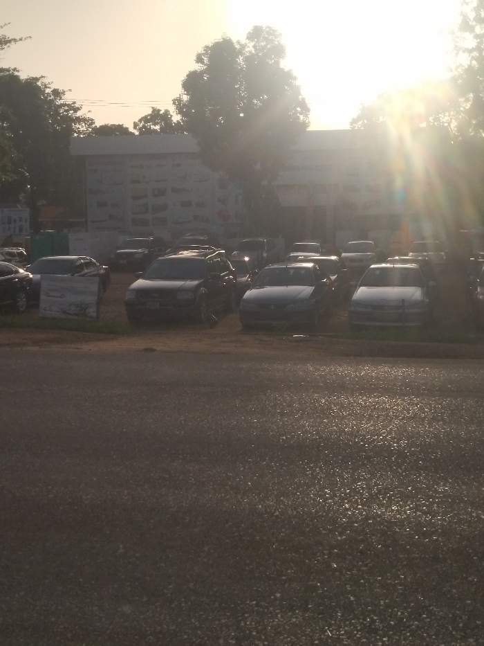 The image depicts a parking lot in the city of Kanshio, Nigeria, with a row of cars parked along the side of the road