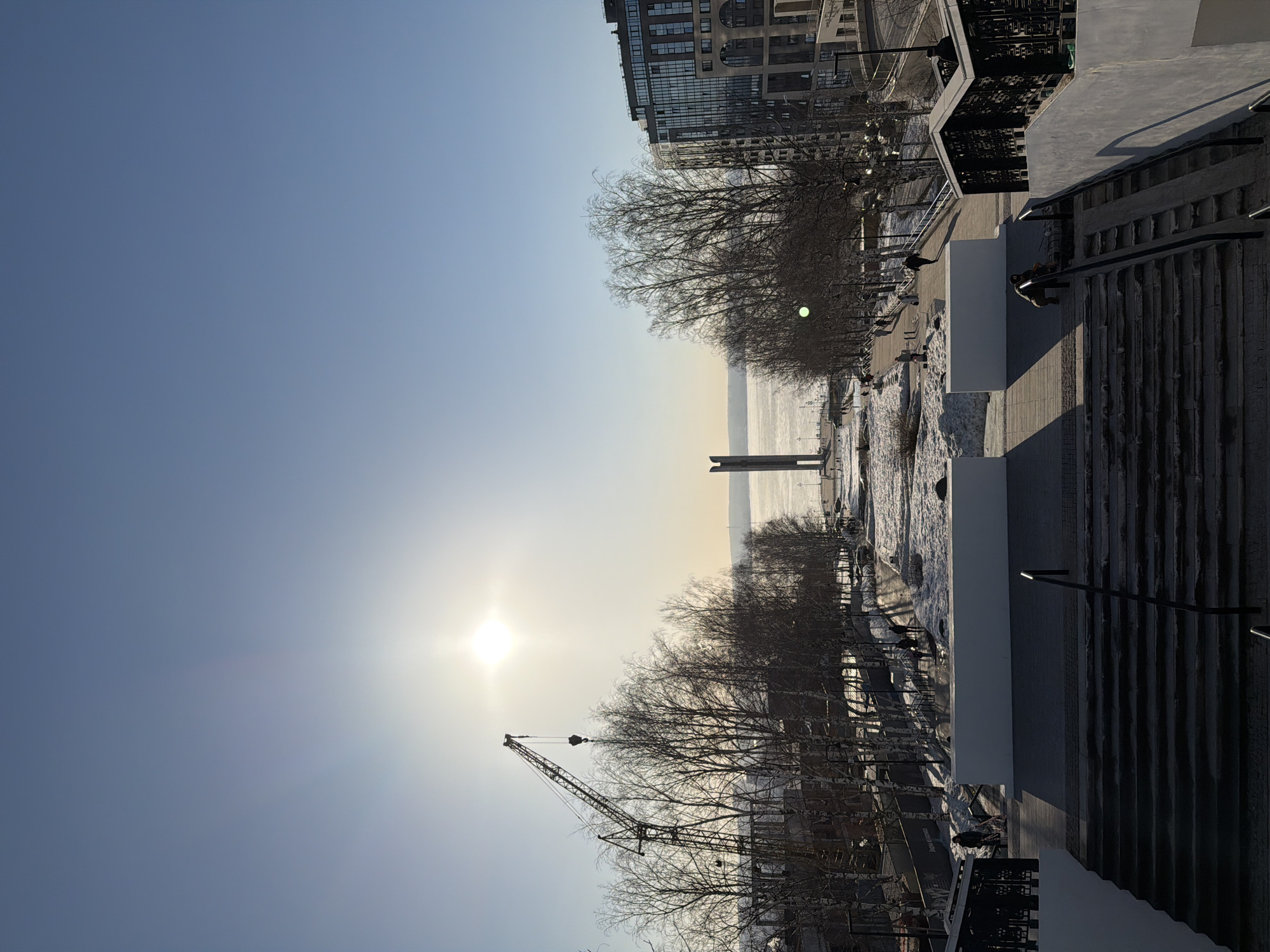 winter scene in Izhevsk, Russia, likely near the Izhevsk Pond. The sun is low in the sky, creating a hazy glow over the frozen body of water. A monument stands in the pond, partially obscured by bare trees. A construction crane is visible in the foreground to the left. A modern building is present on the upper-right of the frame. Steps and a paved area are present in the foreground of the frame. Several people can be seen walking in the area.