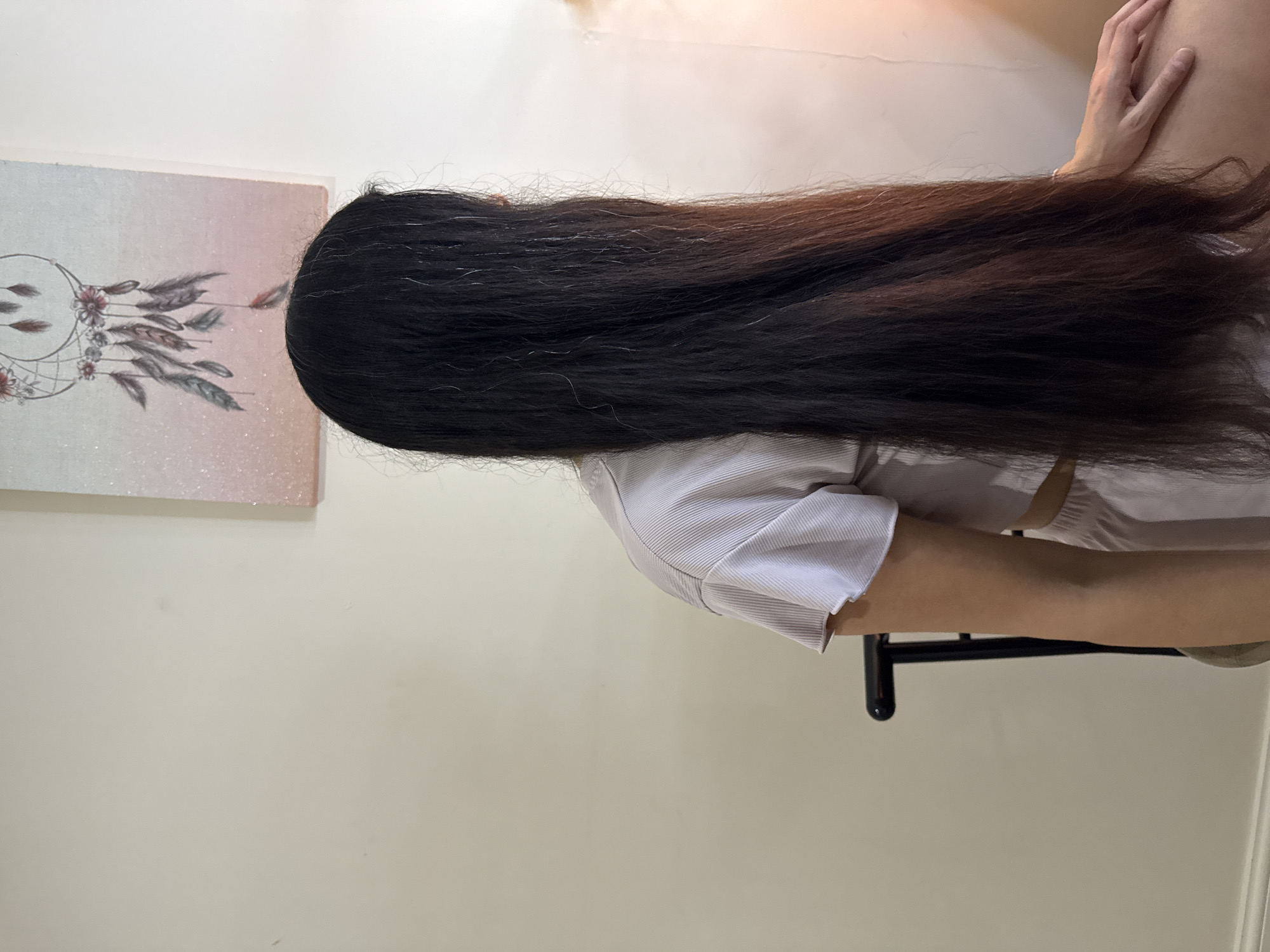 The image depicts a person with long, dark hair reaching down their back. They are wearing a striped white shirt and are seated, with an arm visible. In the background, there's a framed picture with a dreamcatcher design hanging on a white wall. A black metal object is partially visible near the person's arm. The location is not identifiable from the image. The subject is in the Great Yarmouth, United Kingdom.