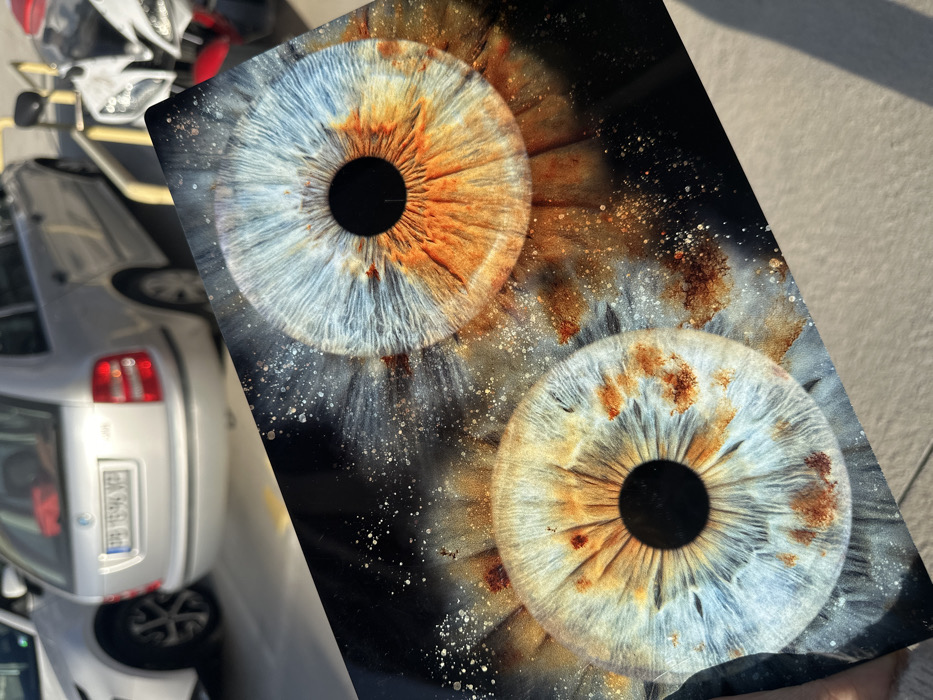 - "A hand holds a rectangular print displaying two magnified human irises, each exhibiting distinct blue/grey and bright orange/brown coloration, against a dark, speckled background" by FM-N7GRt1, licensed under CC BY 4.0