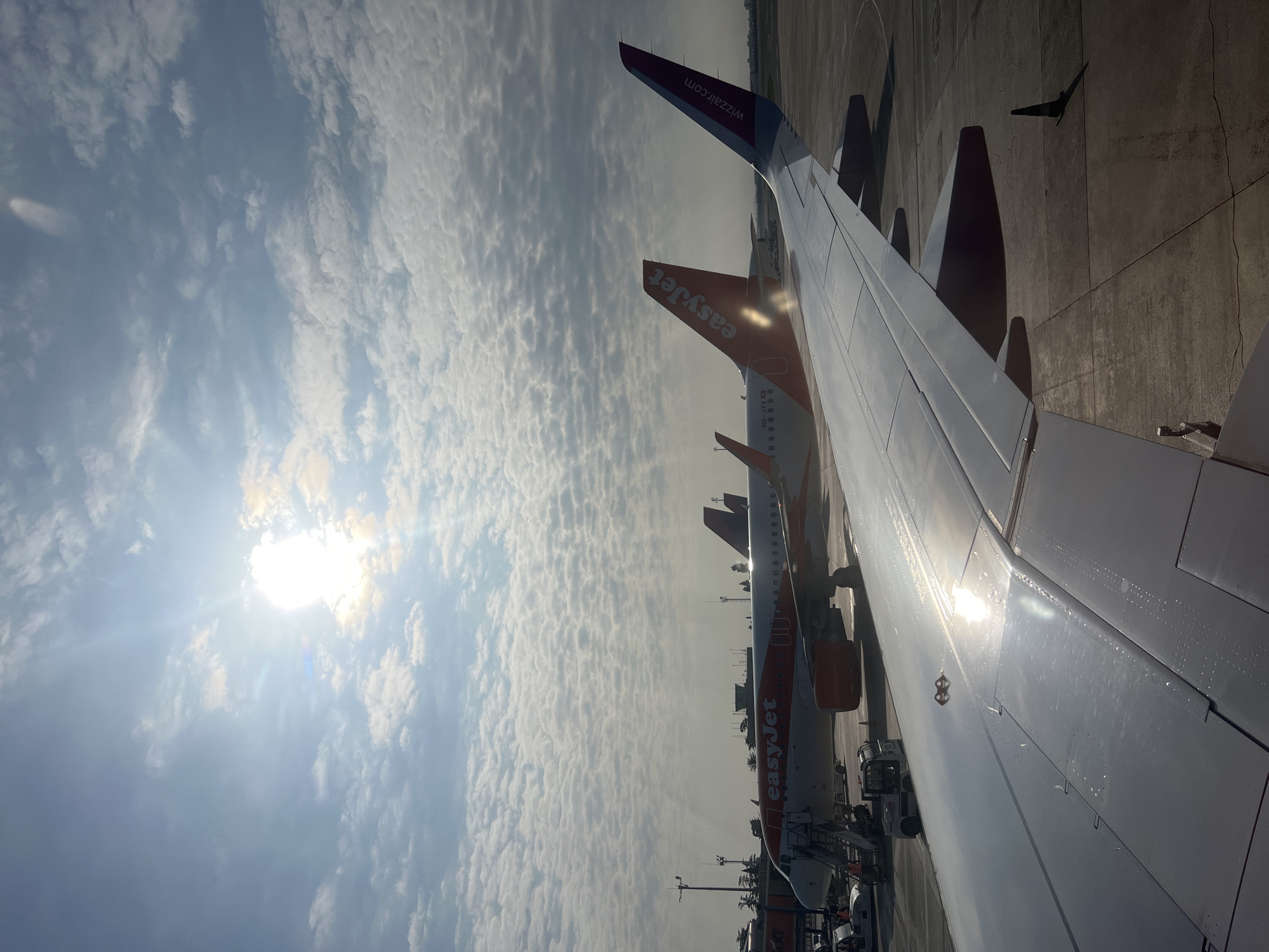 An elevated view from an aircraft window at Valencia Airport in Manises, Spain, depicts an airport tarmac under a sky with scattered cumulus clouds and a bright, partially obscured sun. The polished metallic-grey wing of the observer's aircraft, featuring visible rivets and panel lines, dominates the lower and right-center foreground, reflecting intense sunlight. A red-orange fixture with three prongs is present on the wing's surface. Below the wing, an engine nacelle is partially visible. On the tarmac in the midground, multiple aircraft are parked. Prominently positioned to the left is an EasyJet Airbus A320 series aircraft (registration HB-JXV, visible on the fuselage), featuring a white fuselage with orange engine nacelles and tail, emblazoned with the "easyJet" logo. A mobile passenger stair is connected to its forward door, with one individual discernible near the top of the stairs. Ground support equipment, including a baggage tug and loader, are positioned near the aircraft's nose. Further back, another EasyJet aircraft's orange tail is visible. To the far right, the distinctive purple and white tail of a Wizz Air aircraft, bearing "wizzair.com" vertically, is partially obscured by the observer's wing. In the background, airport infrastructure includes light poles, communication towers, a control tower with a greenish tint, and a line of palm trees. Distant buildings or cityscape elements are visible on the horizon to the far right. The tarmac is a light grey concrete surface with visible expansion joints. A single dark cone-shaped marker stands on the tarmac to the right of the observer's wing, casting a pronounced shadow.