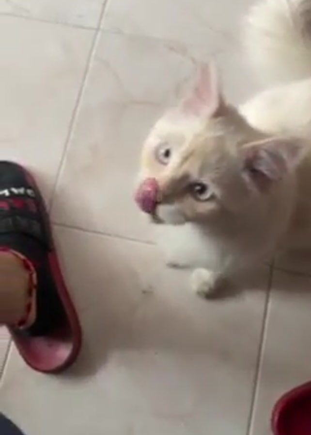 white cat on a white tile floor. There are red slippers on the floor next to the cat. The cat is looking up at the camera and meowing.